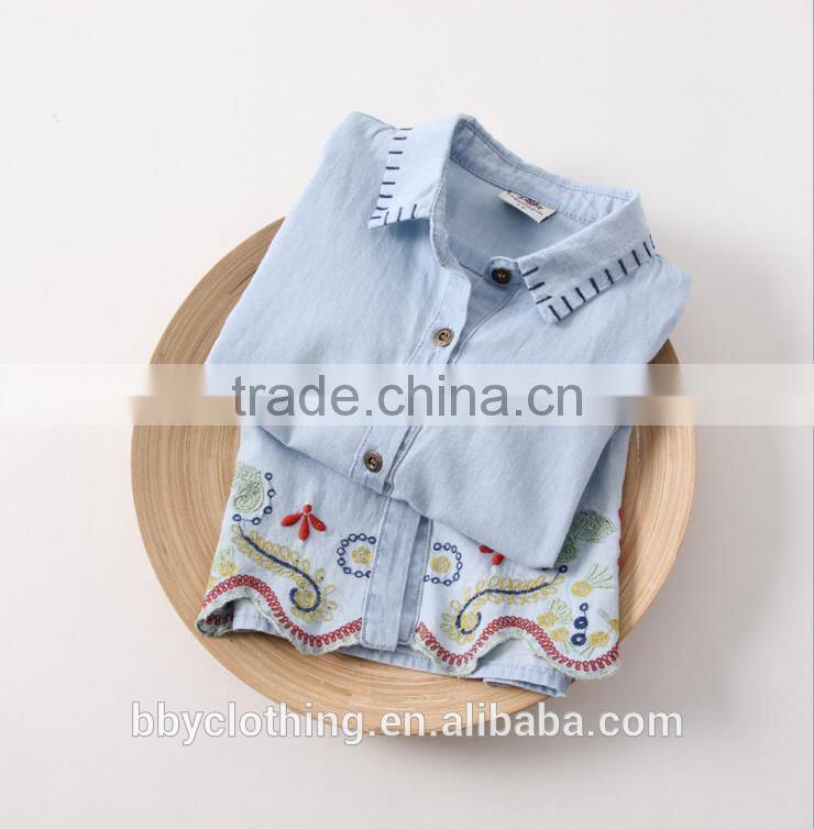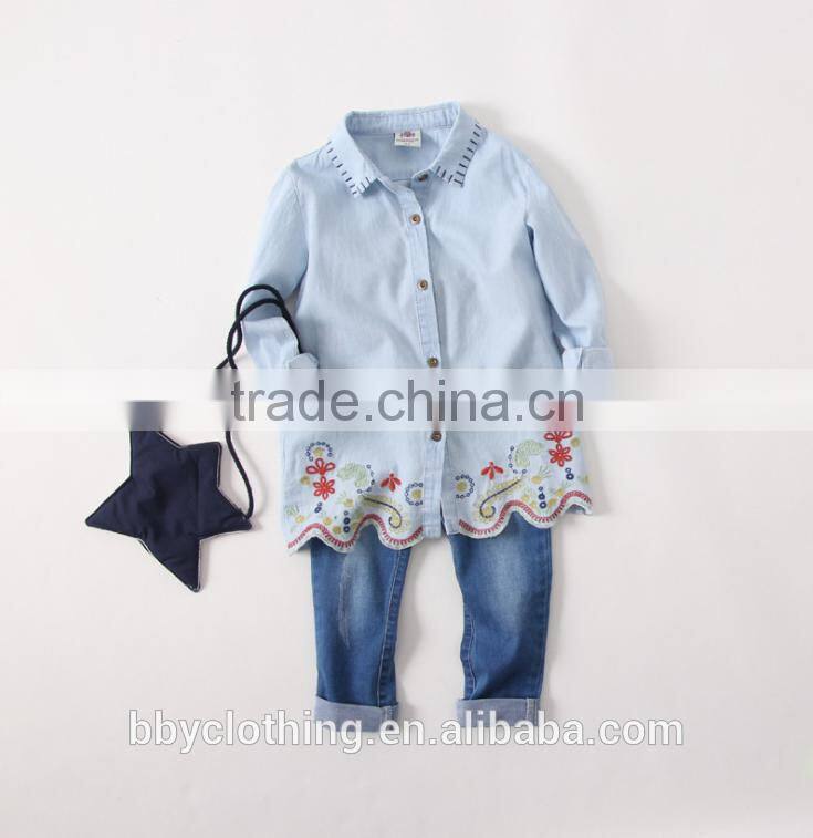 2017 Girls latest long tops designs jeans turndown embroidered shirt