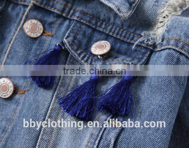2017 Hight Quality Girls Beautiful Tassels Denim Coat on the Two Front Procket