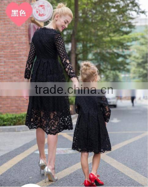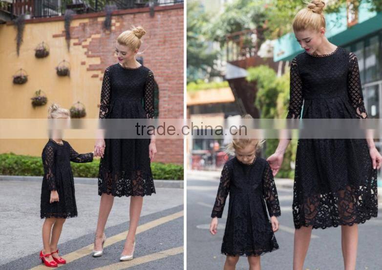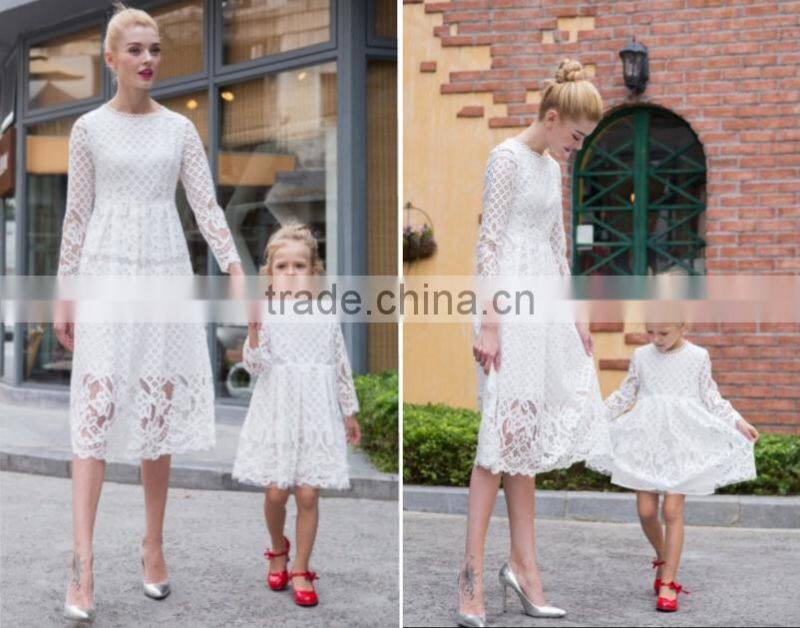 Ready Sale 2017 Girl Child Women Matching Dress Lace Hollow Out Long Sleeve Dresses