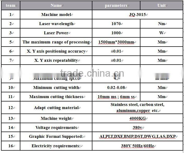 JQ-3015 F 1000W fiber laser cutting machine adopts Raycus laser device which has international advanced laser technology. Equipped with efficient transmission system by Taiwan high-precision gear rack after grinding process and high-precision linear guide. Advanced automatic cypcut control system, group into high precised CNC fiber laser cutting machine.