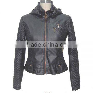 Biker PU leather jacket with hood for lady|faux leather jacket for women duction detail