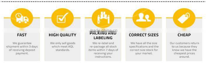 Everyday we will receive many stocks from the factories,Including jacket,T-shirt, shirts, chiffon tops, denim tops, skirts,dress,sweaters,pants,shorts,jeans,cotton-padded jackets and so on with competitiveprice. This wide range of stock lots provide our customers, mainly chain stores or department stores, the opportunity to gain extra profit margin in a highly