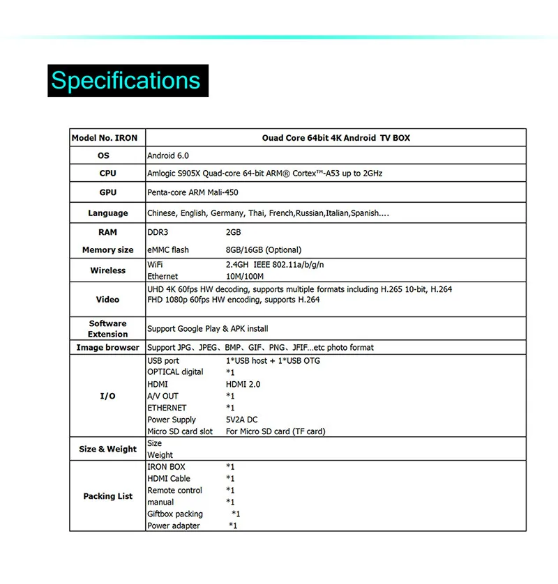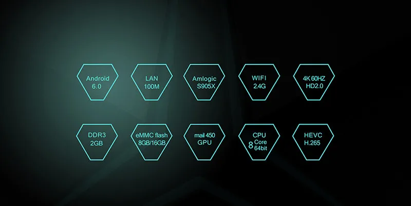 CPU: Amlogic S905X Quad-core 64-bit ARM® Cortex™-A53 up to 2GHz