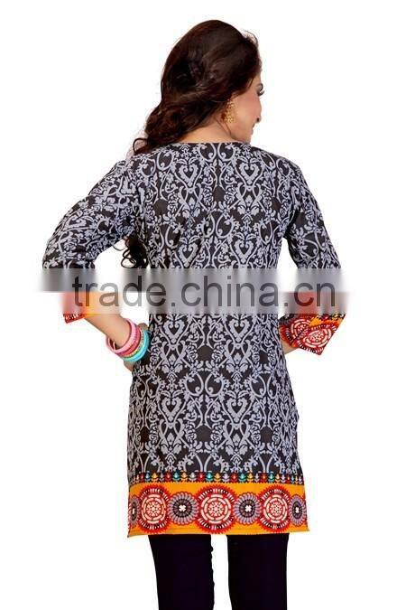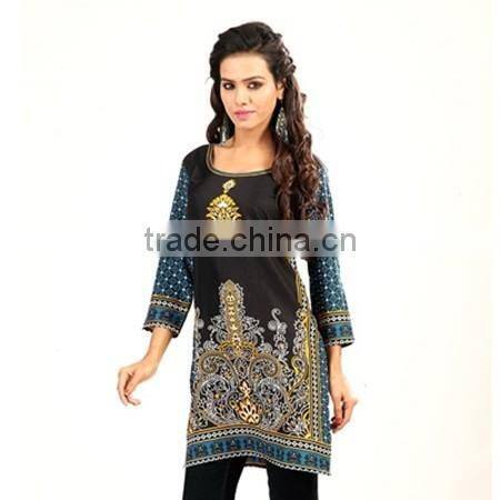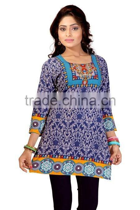 This Eye-Catching Elegant Is Perfect for Any Occasion.This Ari Work & Machine Printed Kurti Keeps Ahead in the Fashionable Kurti industry.This Blue ,Black , Purple , Green Color On Canvas Crape Fabric Kurti is an Original SitatexFashions design .