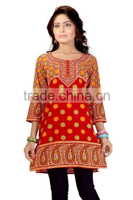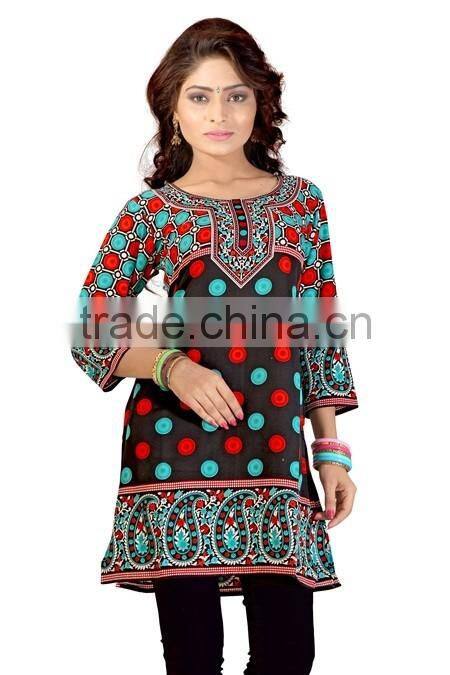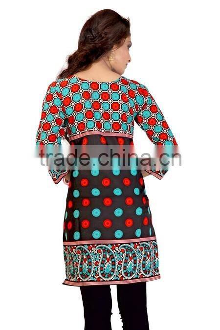 This Eye-Catching Elegant Is Perfect for Any Occasion.This Ari Work & Machine Printed Kurti Keeps Ahead in the Fashionable Kurti industry.This Black ,Orange , Red , Green Color On Canvas Crape Fabric Kurti is an Original SitatexFashions design .