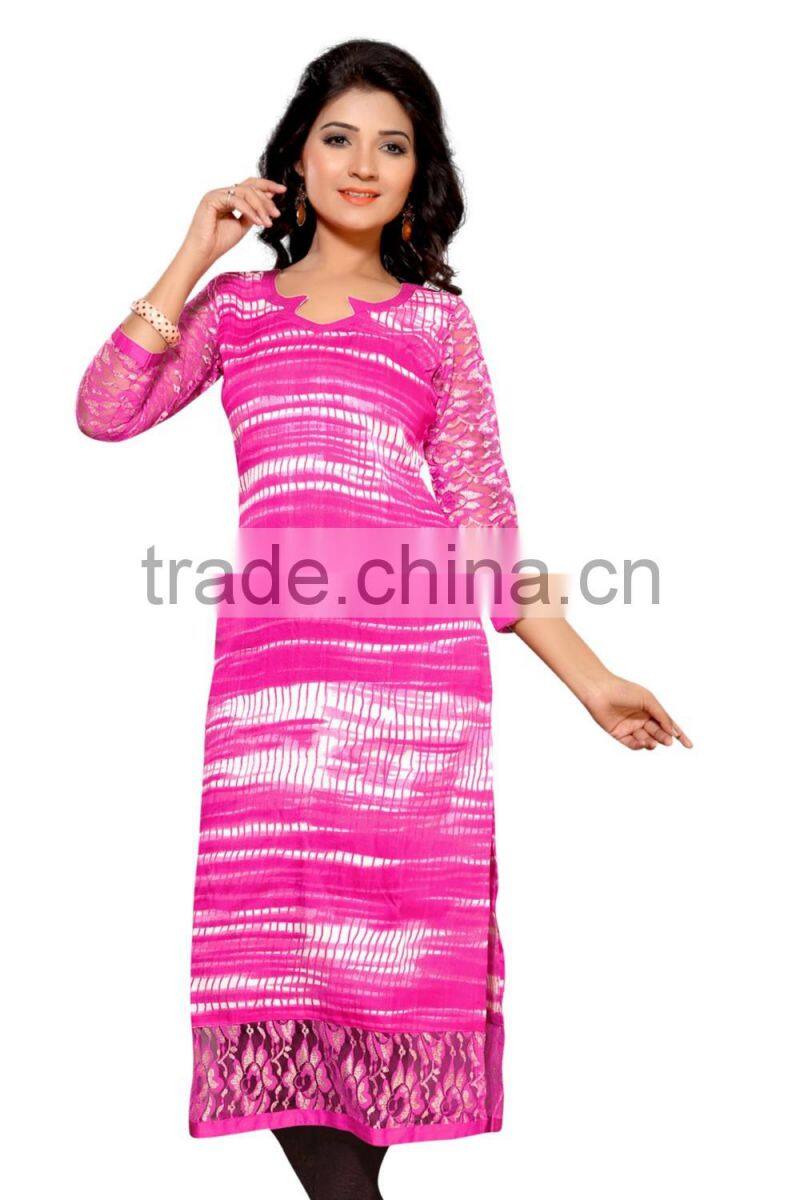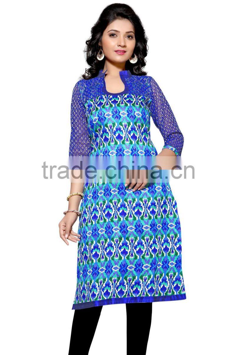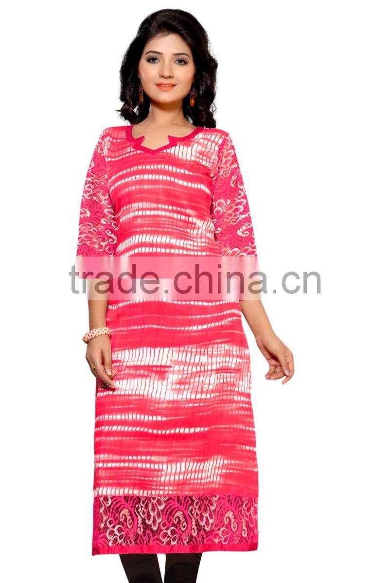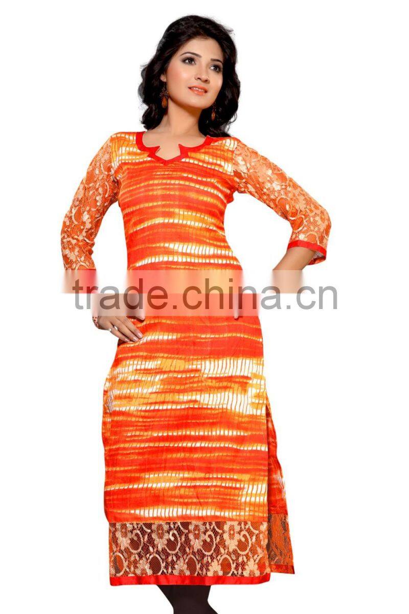 This Eye-Catching Elegant Is Perfect for Any Occasion.This Ari Work & Machine Jute Silk Printed Kurti Keeps Ahead in the Fashionable Kurti industry.This Orange, Pink, Red, Blue Color On Jute Silk Fabric Kurti is an Original SitatexFashions design .