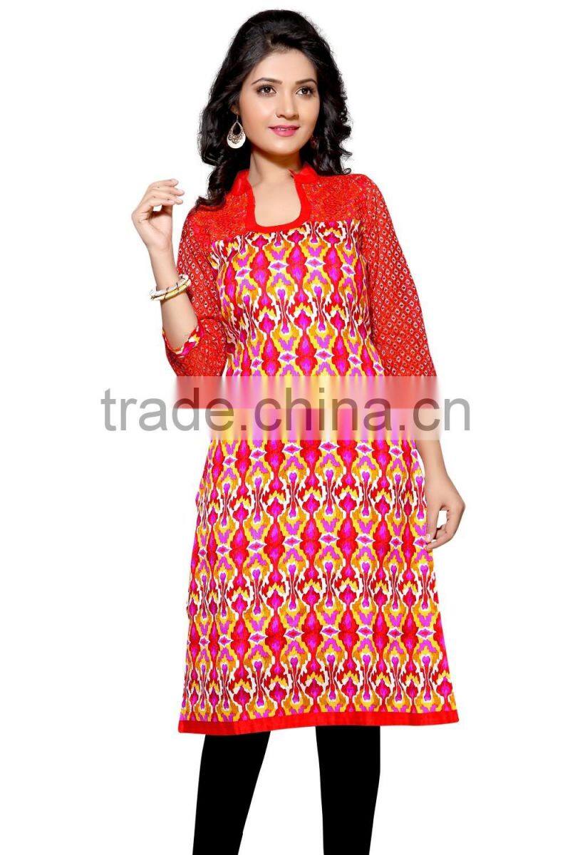 This Eye-Catching Elegant Is Perfect for Any Occasion.This Ari Work & Machine Jute Silk Printed Kurti Keeps Ahead in the Fashionable Kurti industry.This Green, Pink, Red, Blue Color On Jute Silk Fabric Kurti is an Original SitatexFashions design .