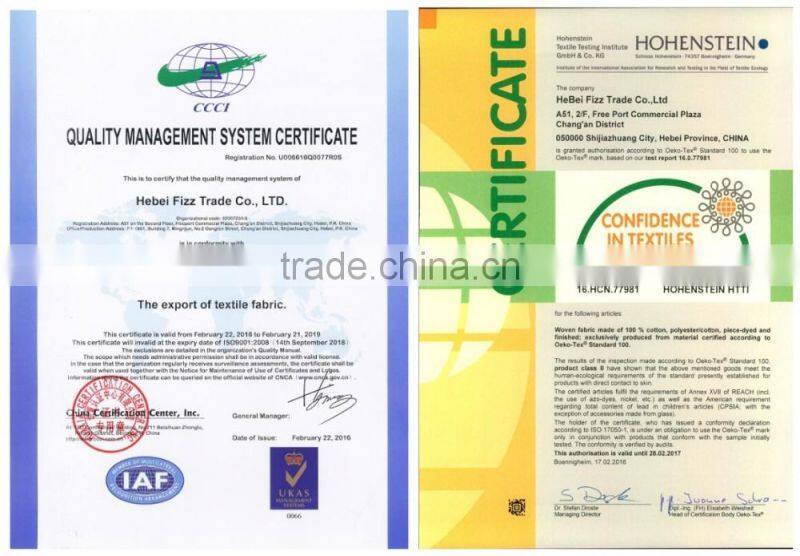 Hebei Feizi Trade Company develops, manufactures and distributes high quality yarns, fabrics, dyeing, and clothing. and also engaged in the functional fabric and clothing weaving. such as flame retardant, waterproof, antistatic fabric and garment. Our products has gained a strong reputation among global customers from America, Australia, Russia, and East Europe.