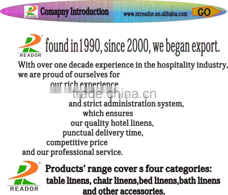 Reador company mainly to manufacture the table linens and chair linens , such as the polyester table cloth , spun poly table cloth , spandex chair cover , spandex table cover , chair sashes ,table runners , etc . As a factory , we have many regular products , we can also do OEM and customization .
