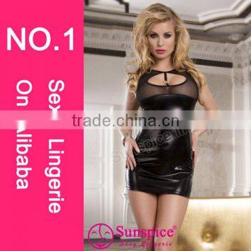 sexy clubwear with wet look and mesh dress and rhinestone decoration on chest, matching G-string |