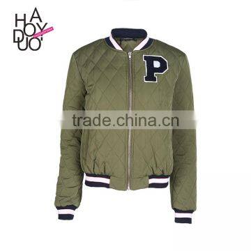 HAODUOYI Women Warm Solid Letter embroidery Lattice Street Zipper Bomber Jacket
