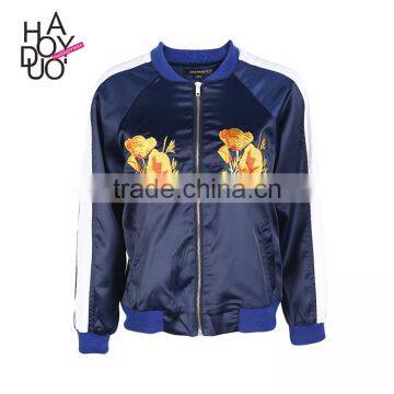 HAODUOYI Women Blue Winter Poppy Writer Bomber Jacket