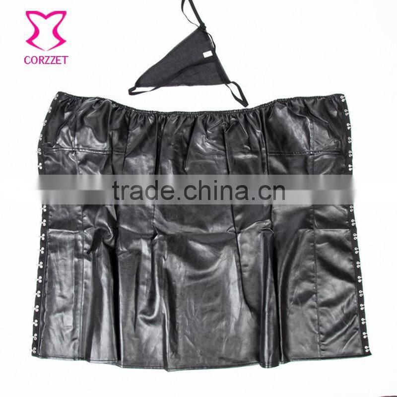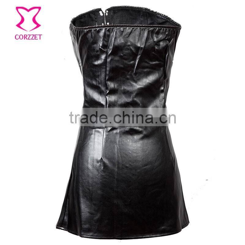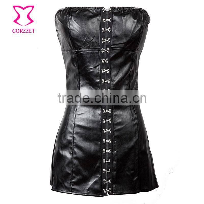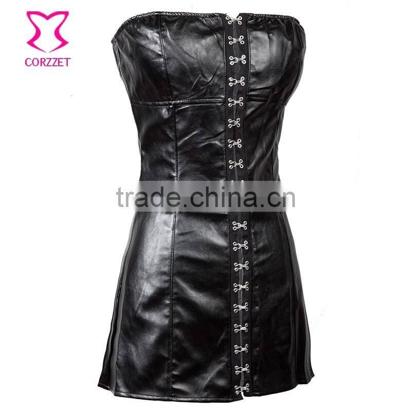 Black Faux Leather Sexy Gothic Corset Dress Front Hasp Strapless Sheath Dresses PVC Club Dress Erotic Women Fashion Dancewear