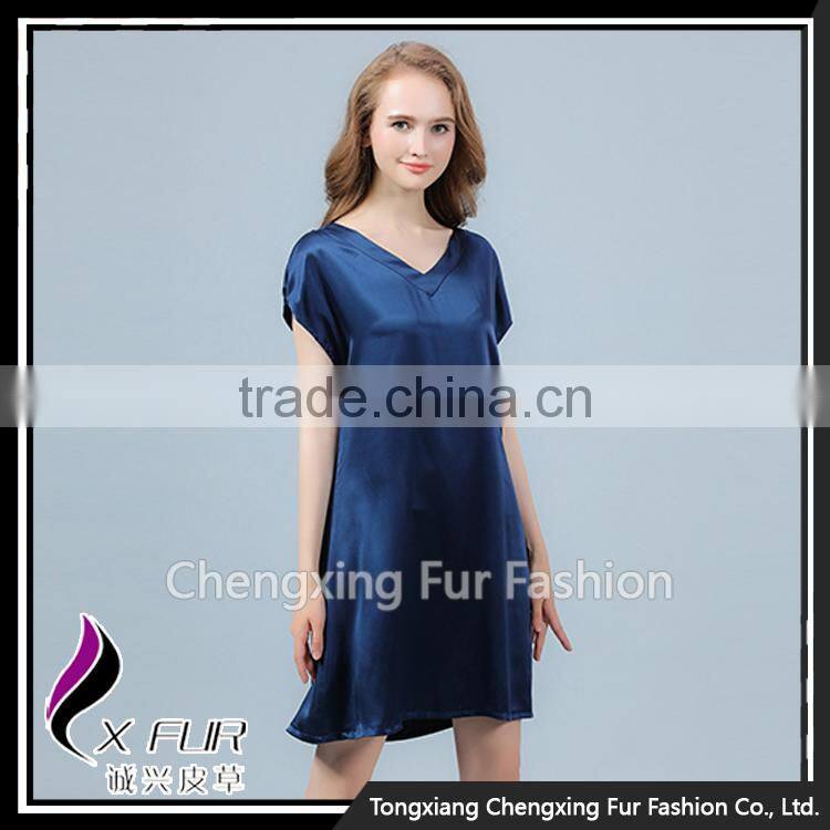 CXVLYQO1 Luxury Women's Pure Silk Skirt Night SNavy Blue Short Sleeve V-neck Pajamas