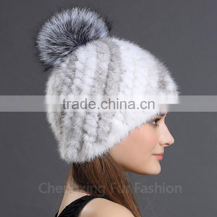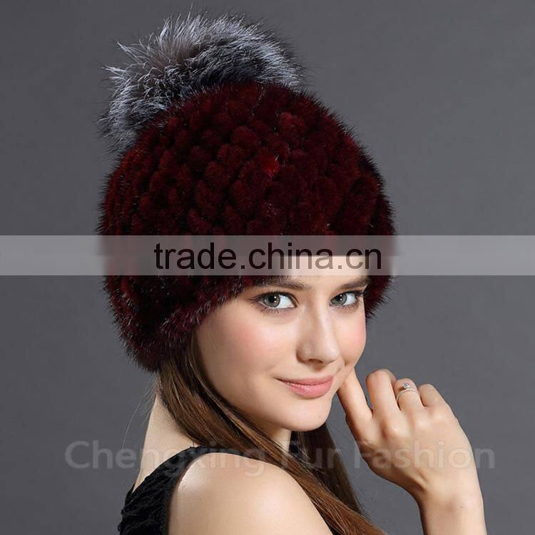 CX-C-42C Fashion Wholesale Genuine Winter Knitted Mink Fur Custom Hat With Silver Fox Fur Ball