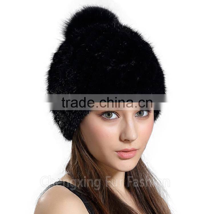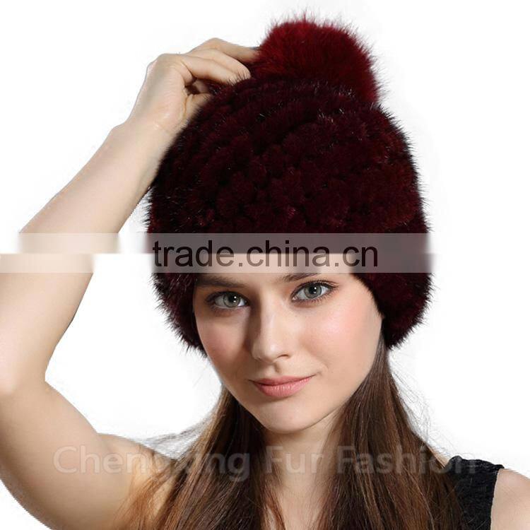 CX-C-239F Women Fashion Fox Fur Pom Pom Winter Knitted Mink Fur Hat