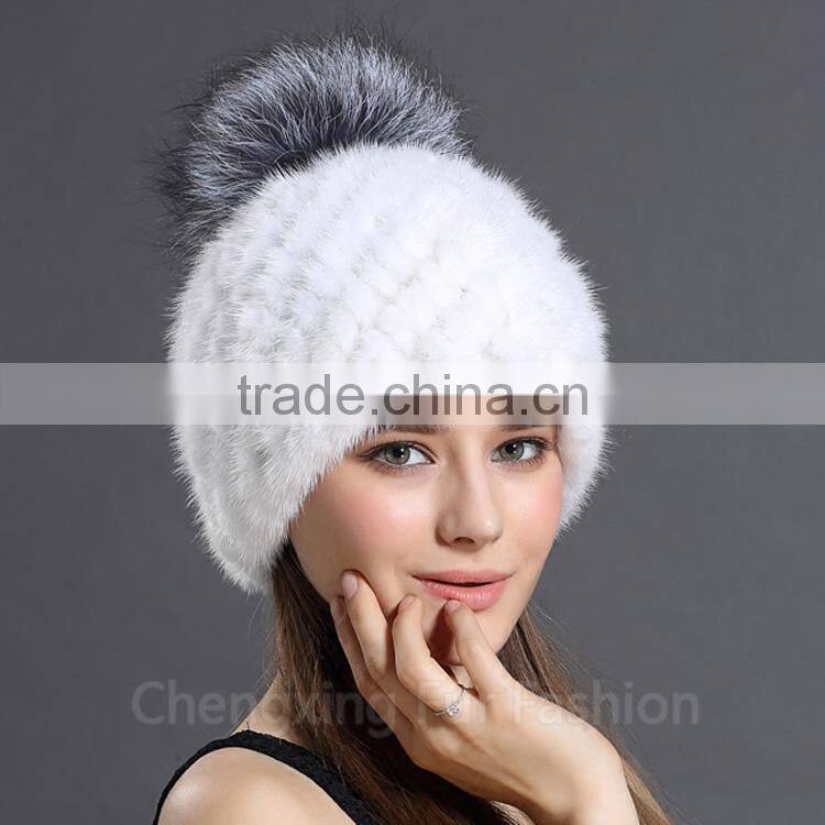 CX-C-239N Women Knitted Real Mink Fur Hats With Fox Fur Pom Pom