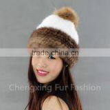 CX-C-239N Women Knitted Real Mink Fur Hats With Fox Fur Pom Pom