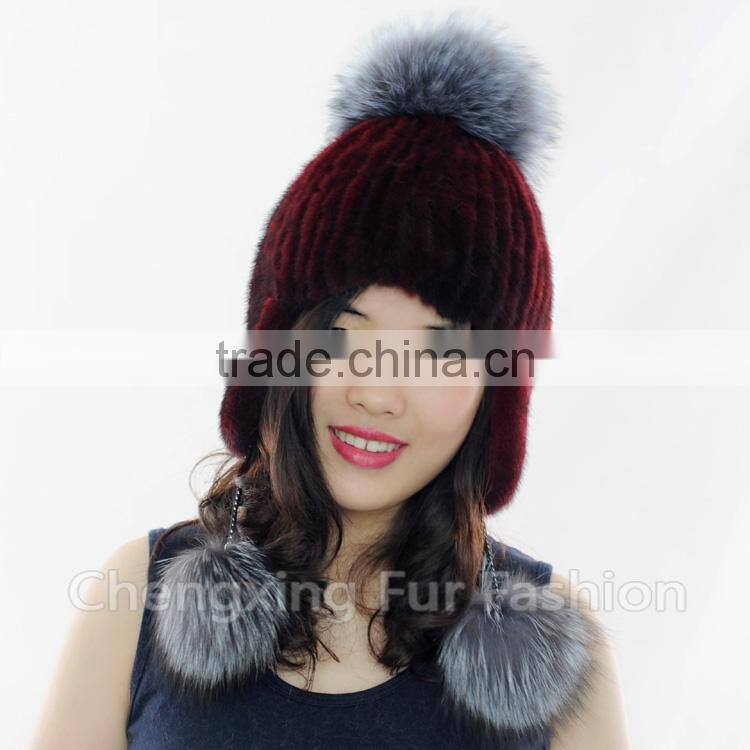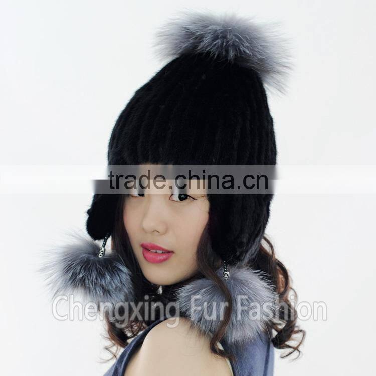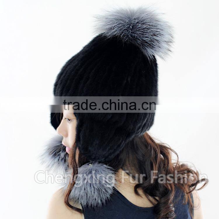 CX-C-42A Hand Knitted Mink/ Silver Fox Fur Pom Pom Hot Sale Lady Hat Wholesale