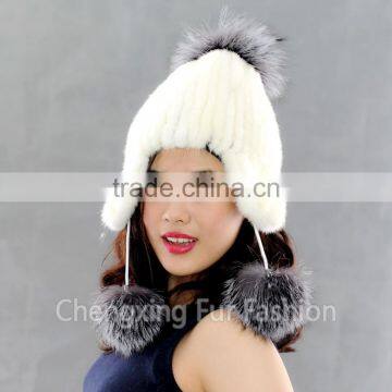 CX-C-42C Fashion Wholesale Genuine Winter Knitted Mink Fur Custom Hat With Silver Fox Fur Ball