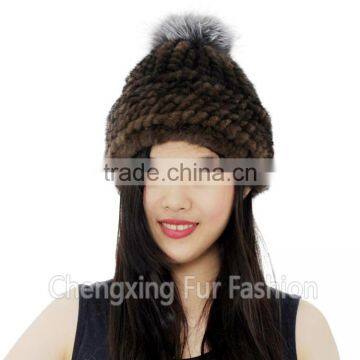 CX-C-239R Spring/Winter Lady Mink Fur Knitted Hat With Genuine Fox Fur Pom Poms