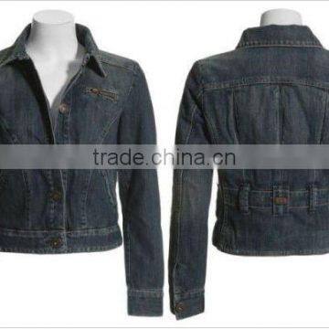 Description: 100% cotton denim. Regulat collat. Button front. Small zip pocket at chest. Front faux welt pockets. Contoured fit with rear pleat details and buckle flap. Cropped. Single button cuffs. FOB Price: USA $ /PCS.