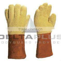 Protective glove, American cut, wing thumb. Para-aramide fibre boucle hand. 15-cm VHT cowhide cuff. Fully wool-lined.