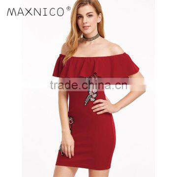 Maxnegio hot sale embroidery flower off shoulder stylish casual dresses |