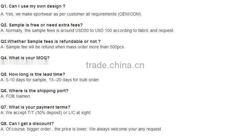 We are professional in manufacturing sports and casual garments. With advancement technology, scientific management and good service, we assure our partners of competitive price, best quality and on time delivery. We have a strict quality control system, a powerful sample designer team and excellent sales team. Our product range covers Running wear, Sportswear, Cycling wear, Swimwear, Outdoor apparal, Casual wear etc.