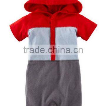 Two-tone baby boy cotton rompers bodysuit with hood for 2014 summer