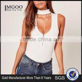 MGOO 2017 High Fashion White Ribbed Bodysuits For Women Sexy Chocker Neck Zip 95% Cotton 5% Spandex Tops