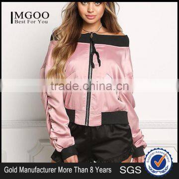 MGOO 2017 Hot Sale Cheap Price Off Shoulder Pink Jackets Custom Fashion Satin Bomber Tops Crop Style
