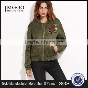 Olive Green Patch Bomber Jacket Wholesale Custom 100% Polyester Lovely Pins Ribbed Trim Satin Winter Jacket