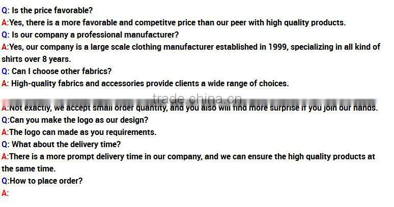 1.Professional leading manufacturer for custom dress shirt, man shirt, woman shirt, polo shirt, jacket, jeans and so on.