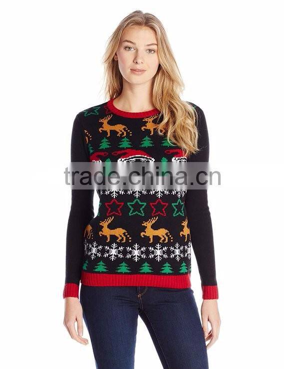 Black Fancy Pattern Jacquard Pattern Cotton Pullover Women Knitted Christmas Sweater