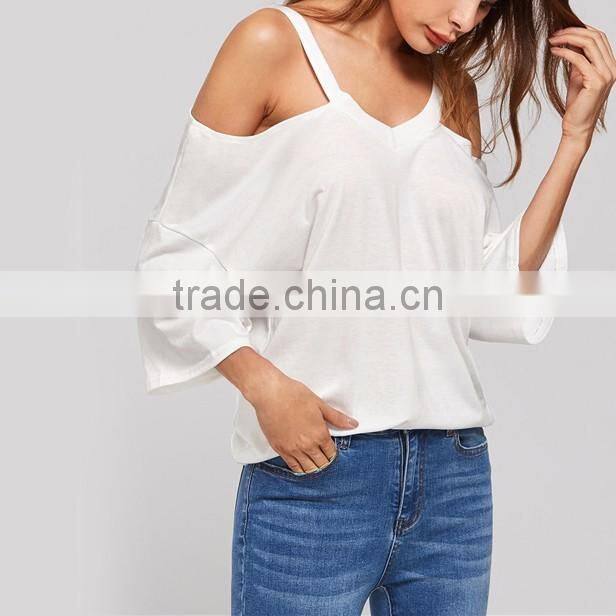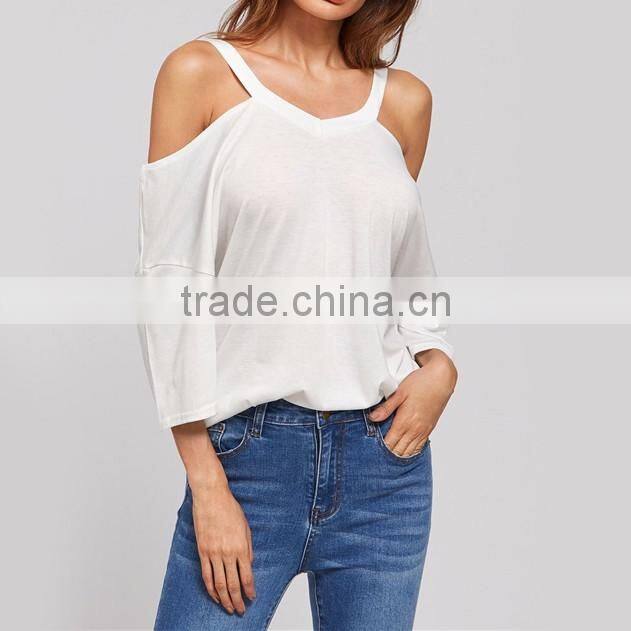 Cut Out White Strap T-shirts Sexy Basic 3/4 Sleeve Women Summer Tops 2017 Cold Shoulder Brief Stretchy V Neck T-shirt