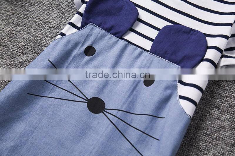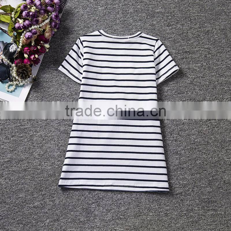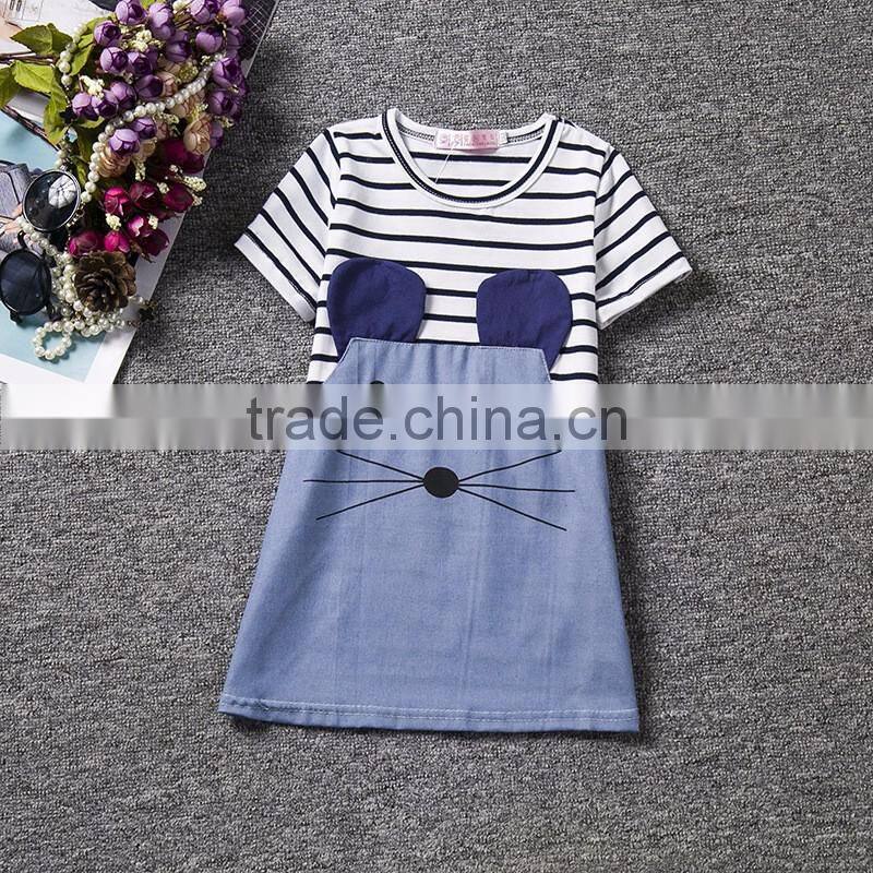 Summer Little Girl Dress Striped Demin Stitching Dress Short Sleeve Cartoon Dress Baby Colthes#A00296