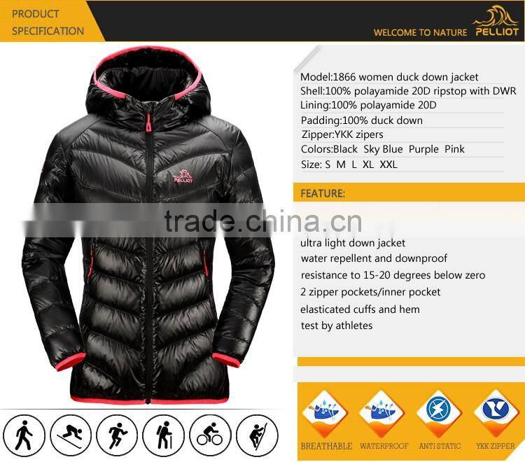Specification | Sport Type: Hiking & Casual Shell:100% nylon 20D ripstop with DWR Inner: 100% nylon 20D ripstop with DWR Padding:90% down 10% feather Zipper: YKK nylon zipper Color: Black Sky Blue Purple Pink Size: S M L XL XXL Features as Below: Ultra lightweight jacket Water resistant and Downproof Adjustable Zip off Hood 2 zip pockets Inner pocket Elasticated cuffs and hem |