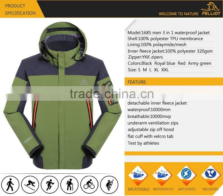 Specification | Sport Type: Hiking & Climbing & Causel Shell:100% Polyester TPU Membrane Inner fleece jacket:100% Polyester Zipper: YKK or customizable Size: S M L XL XXL or customizable Feature as below: 3 in 1 outdoor jacket All taped Seams Detachable inner fleece Water Column: 10000mm MVTR: 10000g/m2/24h Adjustable Zip off Hood Underarm Ventilation Zips Flat Cuff with Velcro Tab |