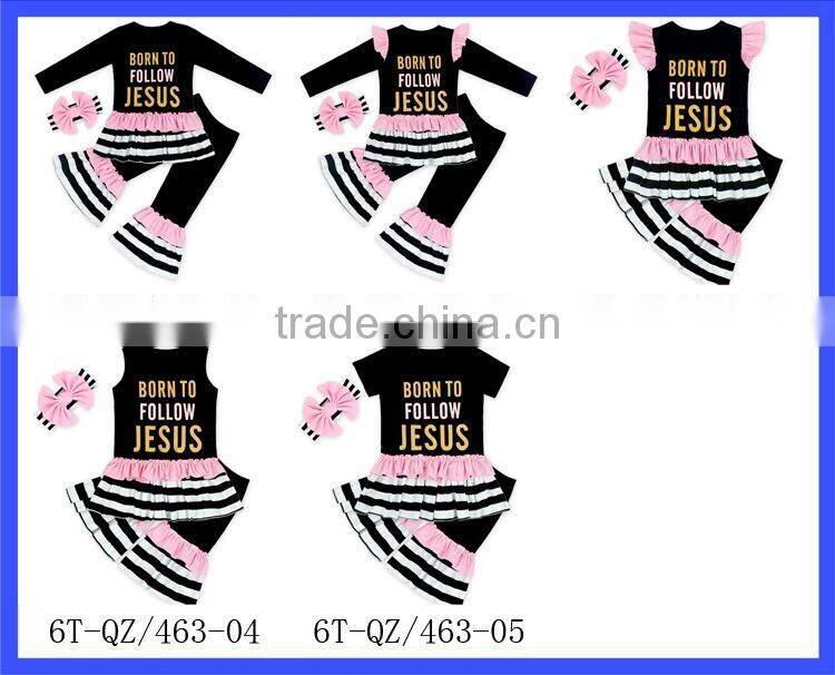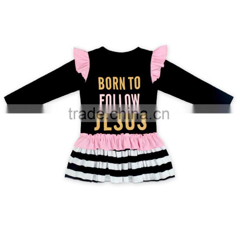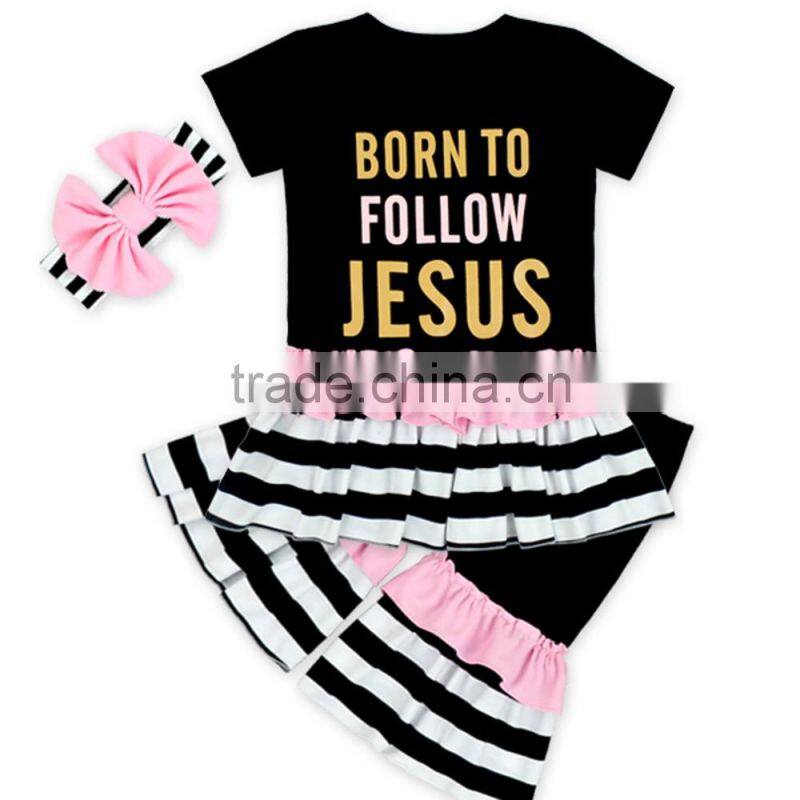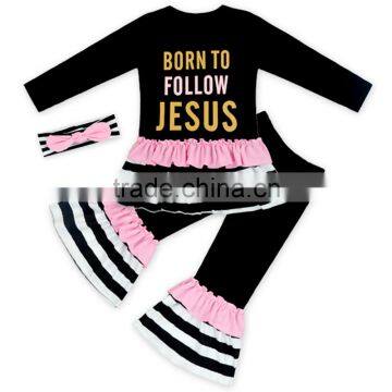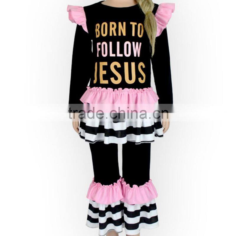 66TQZ463 Yiwu Lovebaby Cotton & Polyester Wholesale Long Sleeve Black Top Big Ruffle Bottom for Easter Day Remake Boutique Set