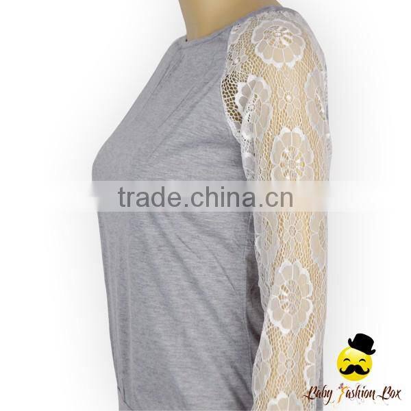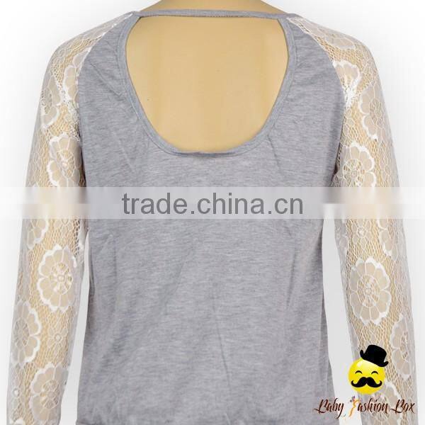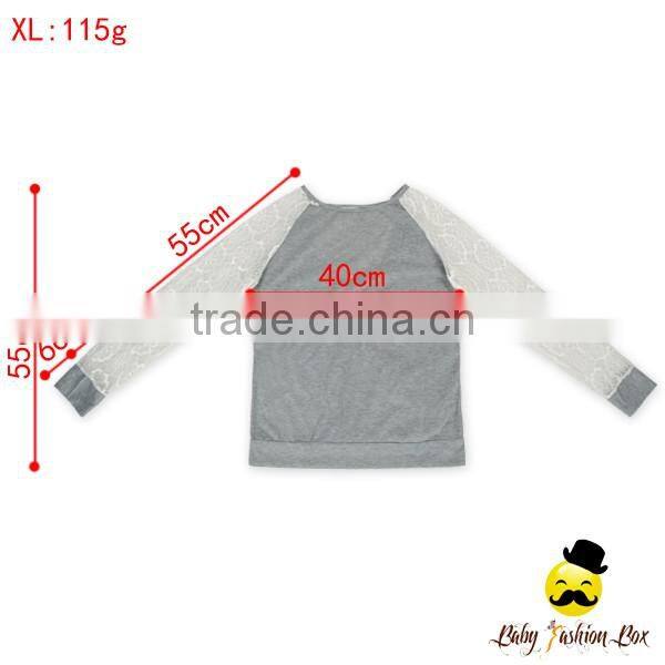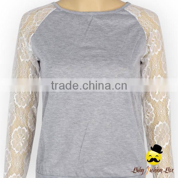 2017 Spring Cheap Adult Lady Transparent Lace Floral Long Sleeve Plain Gray Breathable Cotton Raglan Casual Shirt