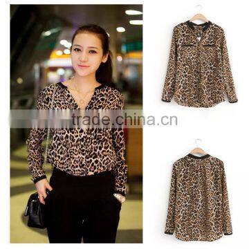 2015 Women Blouse Leopard Print Shirt Long sleeve V -Neck Top Loose Blouses Plus Size Chiffon Shirt
