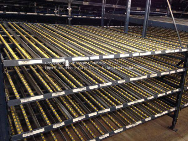 The rack is dynamic storage providing double functions of storage and conveyor. The goods is transferred from the entrance to the exit of the rack through the gradient fluent strip, achieving the first in and first out sequence. The system is suitable for the occasion of the arket distribution center, production assembly line, small goods transferring and sorting operation etc.