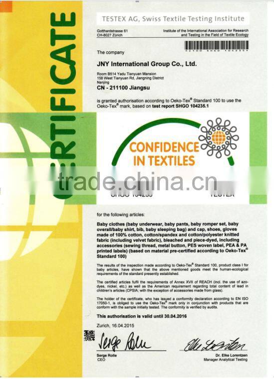 Our company is mainly engaged in baby pants ,baby romper set,baby overall/ baby shirt,bib,baby sleeping bag and cap ,shoes,gloves made of 100% cotton,cotton/spandex and cotton/polyester knitted fabric ,bleached and piece-dyed,including accessories(sewing thread ,meterial button,PES woven label,PEA&PA printed labels)