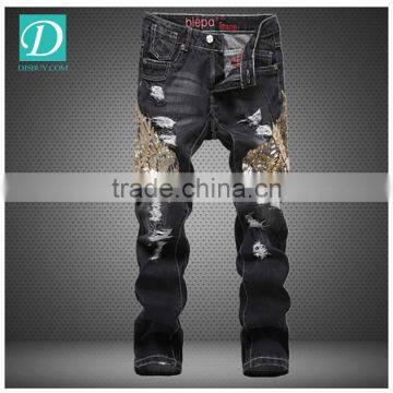 new stytlish men sequin gold wings slim straight trousers ripped frayed jeans