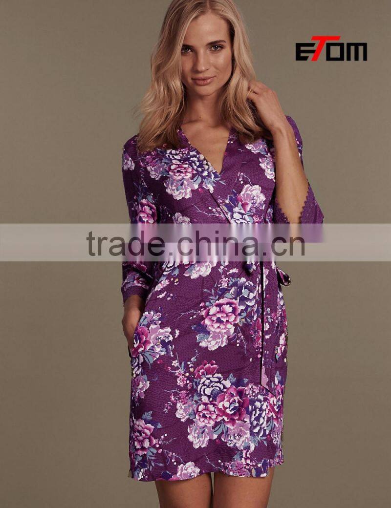 Customize Ladies Luxury Printing Silk Satin Knee Length Robe, Sexy Lace Trim Long Sleeve Kimono Robe 2017013