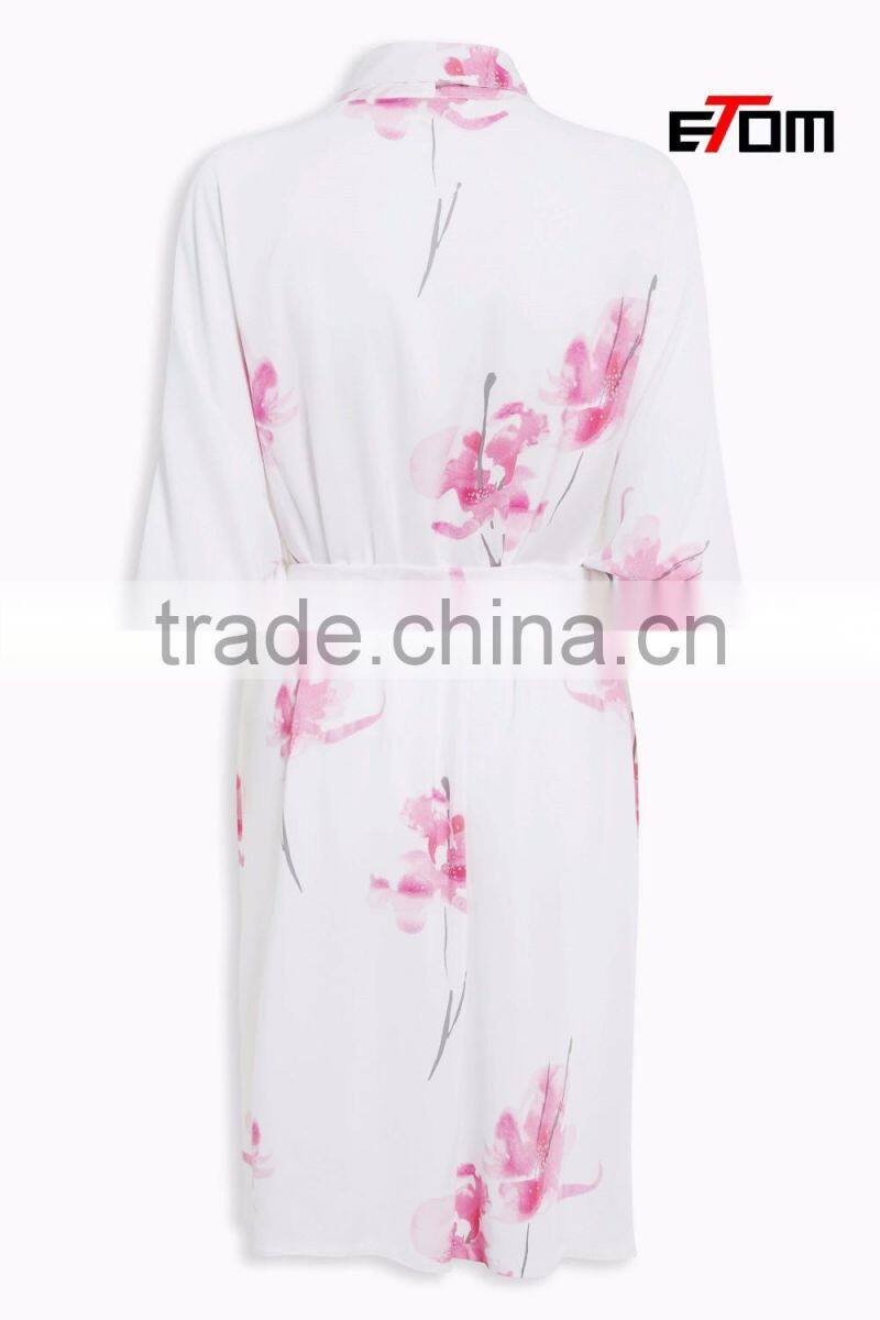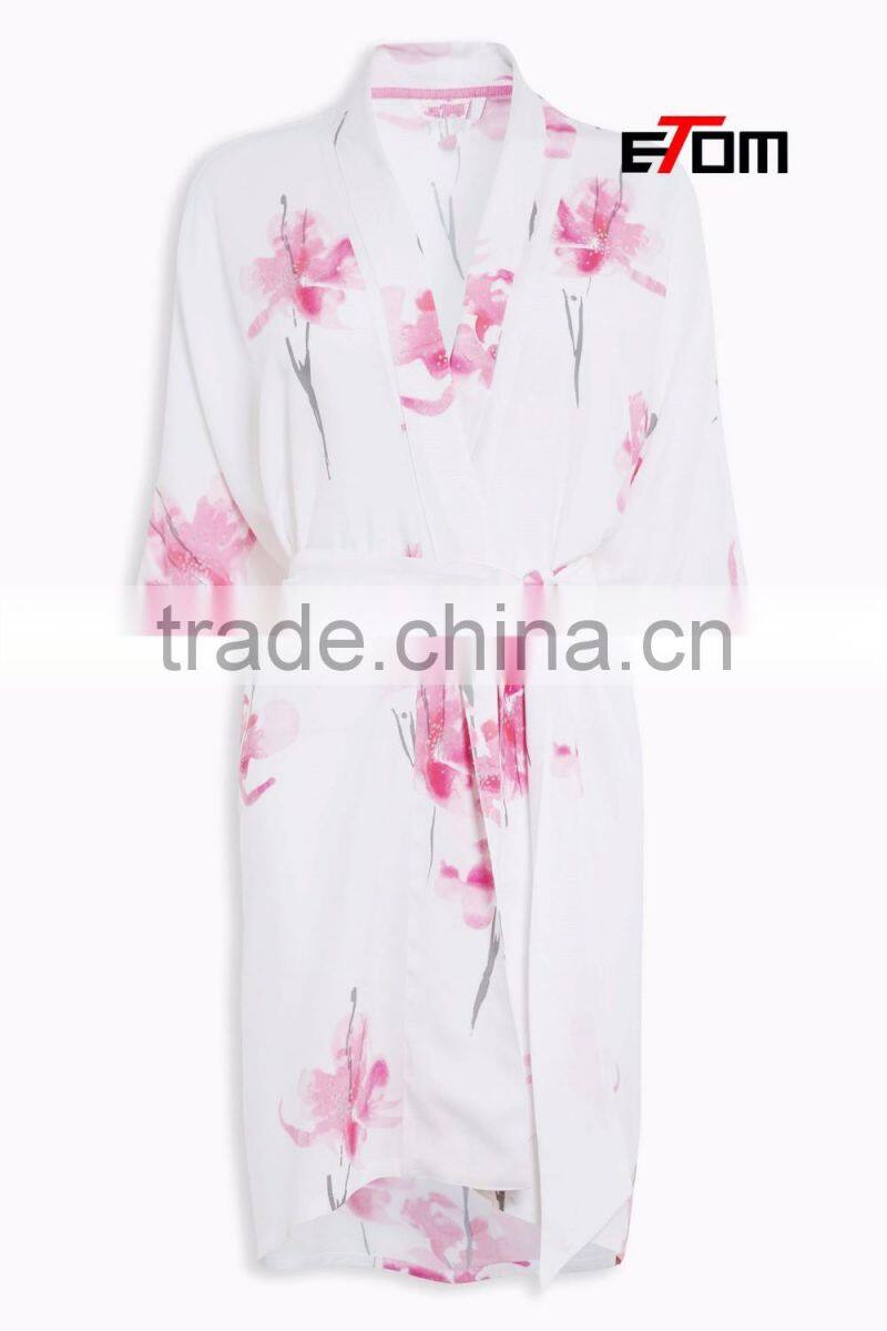 Customize Ladies Luxury Printing Silk Satin Knee Length Robe, Sexy Lace Trim Long Sleeve Kimono Robe 2017013