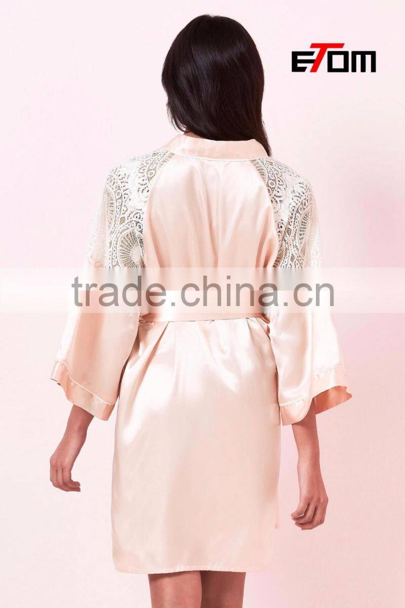 Customize Ladies Luxury Silk Satin Knee Length Robe, Sexy Lace Trim Long Sleeve Kimono Robe 2017011