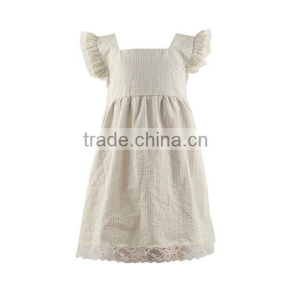 Summer Boutique Tan Seersucker Babies Frog Dress With Outlook Flutter Sleeve Ruffle Infant Baby Cotton Dress With Lace Hemline