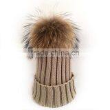 Myfur Wool Knitted Beanie Hats With Natural Color Raccoon Fur Pom Pom